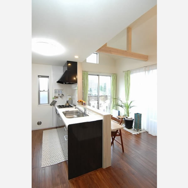 洗濯機は引き戸を付けた小スペースに、キッチン用品はパントリーにと、隠す収納で室内はいつもスッキリ。ダイニングにはテーブルを置かず、その分キッチンのカウンターをワイドに設定しました。「ちょっとお酒を飲みたい時はカウンターで居酒屋気分(笑)」とご主人が言えば、「家事が楽しくなりました。前に人がいると嬉しいですよね」と奥様。新しい住まいが、家族の暮らしに笑顔を増やしました。