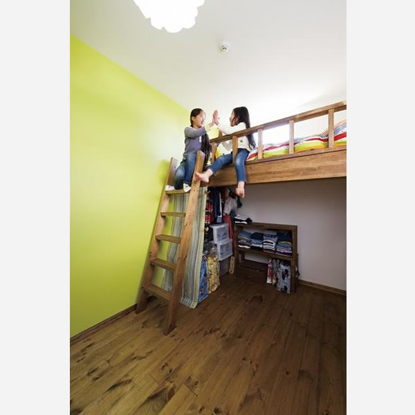 自然素材の風合いを活かした住まいは、ご夫婦のこだわりがたくさん盛り込まれました。1階は寝室と子供部屋。小さい4.3帖の子供部屋は、造り付ベッドにして部屋を有効的に利用出来る。またアクセントカラーのピンクやブルー壁が、ステキ!