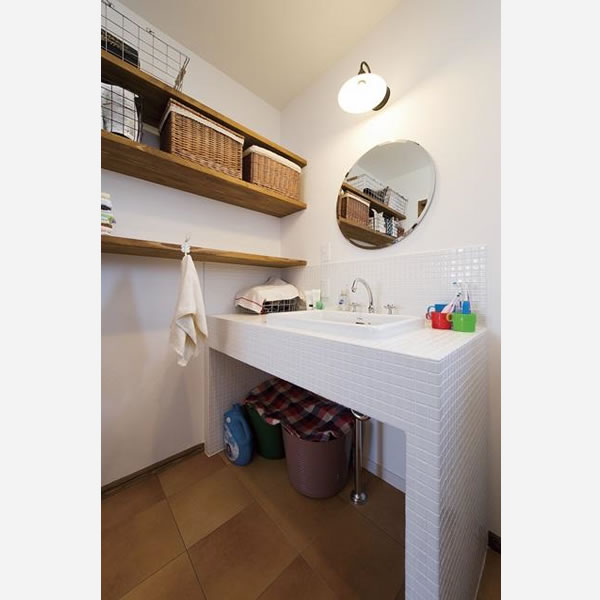 ☆タイルの洗面台にフランス製の水柱。丸い鏡が、かわいいオリジナル化粧台。