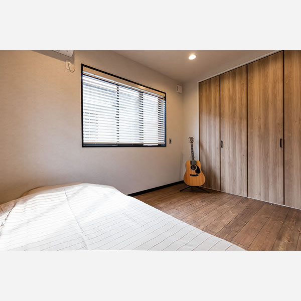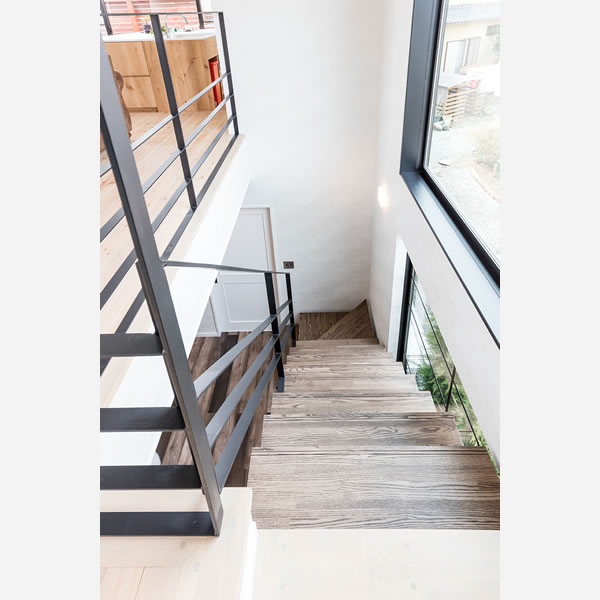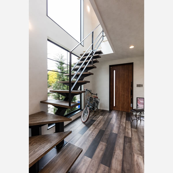 木とガルバリウムをミックスした、ハイブリッドな外観がひときわ目を引くM氏邸。住む人の家へのこだわりは、玄関からも見てとることができます。ドアを開けると、そこには土間がありません。耐水性・耐久性の高い床材を敷き詰めることで、玄関とホールが一体化したモダンな空間に仕上げました。これは、愛犬との暮らしを楽しむための仕掛け。「散歩帰りの世話がとっても楽になりました」とMさんは微笑みます。さらに、玄関ホールからは洗面・浴室、